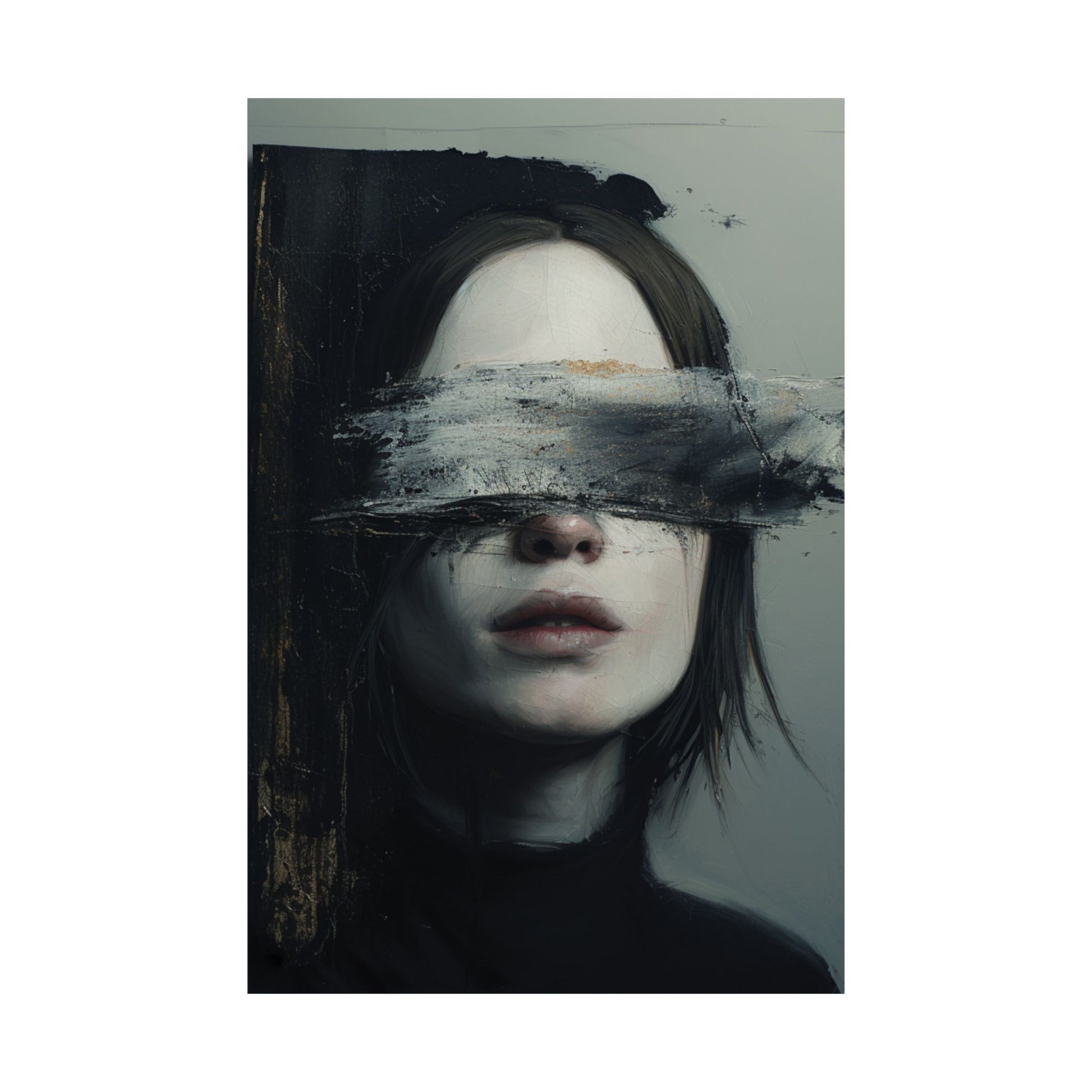 This hauntingly powerful Blind Expression Poster features a striking female portrait — her eyes obscured by a rough, visceral brushstroke, leaving the viewer suspended between presence and mystery.